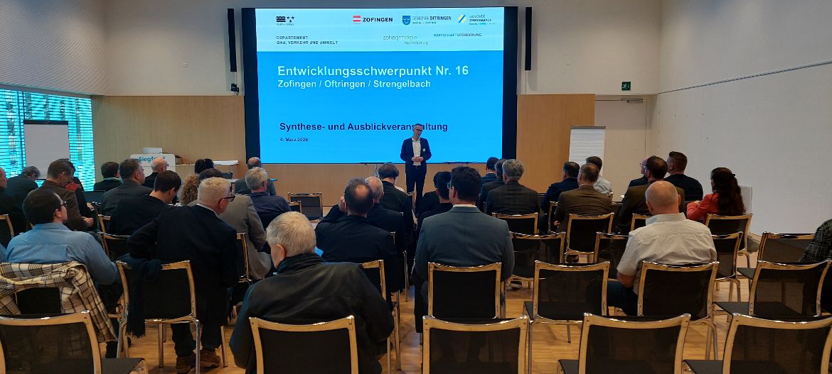 „Gemeinsam wollen wir einen Beitrag zur wirtschaftlichen Zukunftsfähigkeit unserer Gemeinden leisten“, sagte der Zofinger Stadtpräsident André Kirchhofer, als er am 4. März 2026 rund 50 Personen zur Synthese- und Ausblickveranstaltung des Projekts „Umsetzung Entwicklungsschwerpunkt (ESP) Nr. 16“ im Forum Siegfried begrüsste. Eingeladen waren die im Projektperimeter ansässigen Grundeigentümerschaften, Firmen und Mietenden.